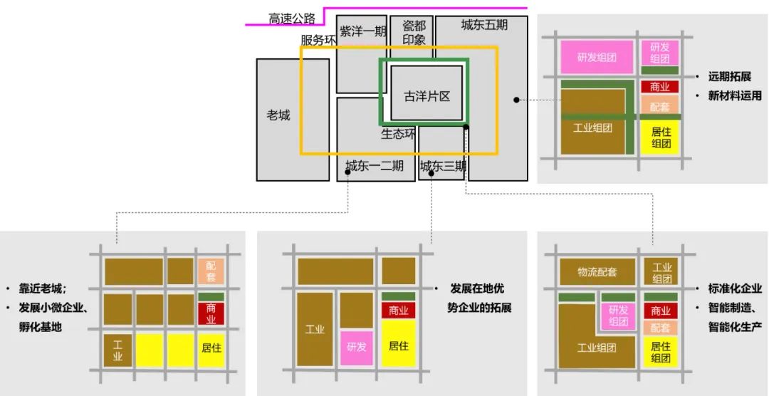 不同类型的产业单元匹配相应的产业类型,应对产业快速发展的不确定性及未来科技发展的不可预见性,提出地块的多元适配方式,有效应对未来进驻企业的不同发展需求。