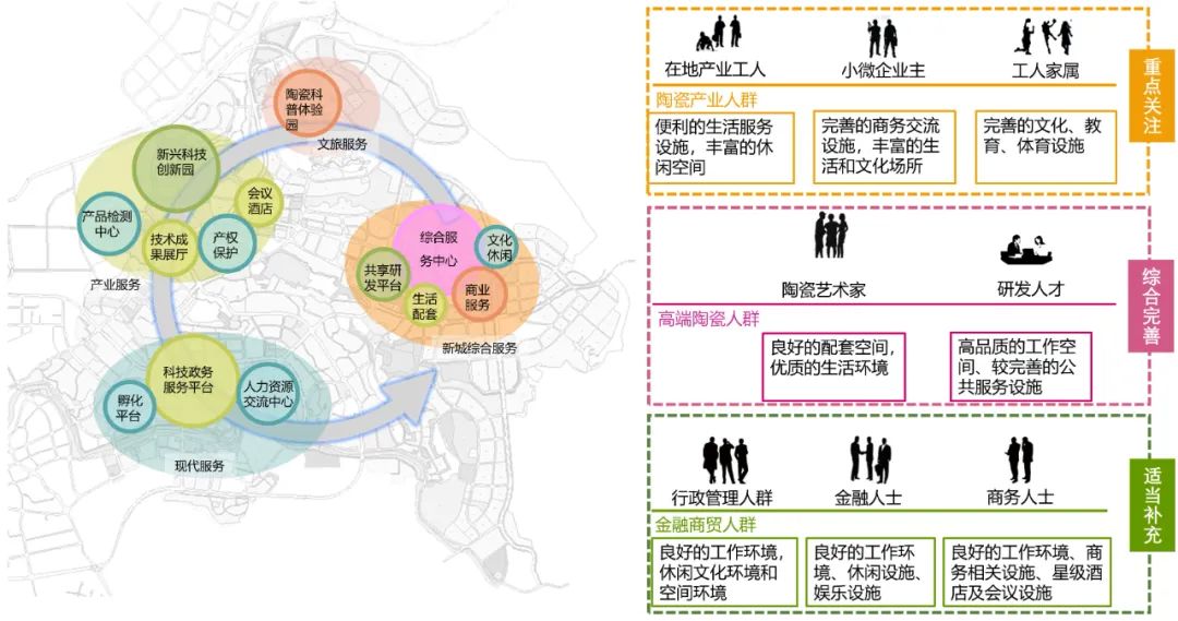 以生产智造为核心,配套四大产业服务中心,结合城东不同园区定位植入适合的功能配套,推动各园区的个性发展。同时考虑不同人群的差异需求,针对性地在新城空间内进行配套,从服务人群规模出发,在配套类别和数量上提出重点关注陶瓷产业人群需求、综合完善高端陶瓷人群需求、适当补充金融商贸人群需求。