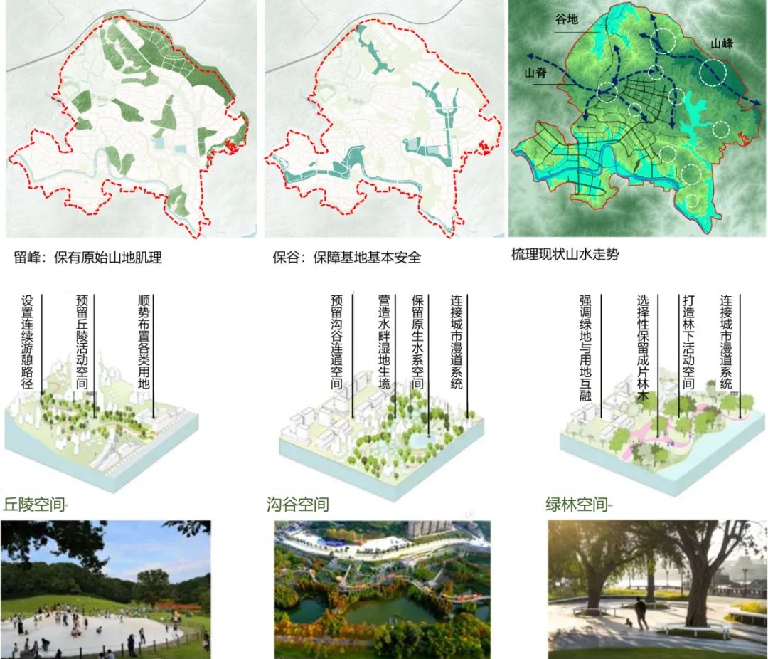 梳理与提取山峰、谷底、山脊等自然地形走势,适当保留山峰与山脊线区域,突出德化丘陵特色风貌。针对自然要素的特质,提出化景成园的处理手法,将场地中丘陵、沟壑、林地等特色地貌形态,转变为聚集活力要素的核心场所。